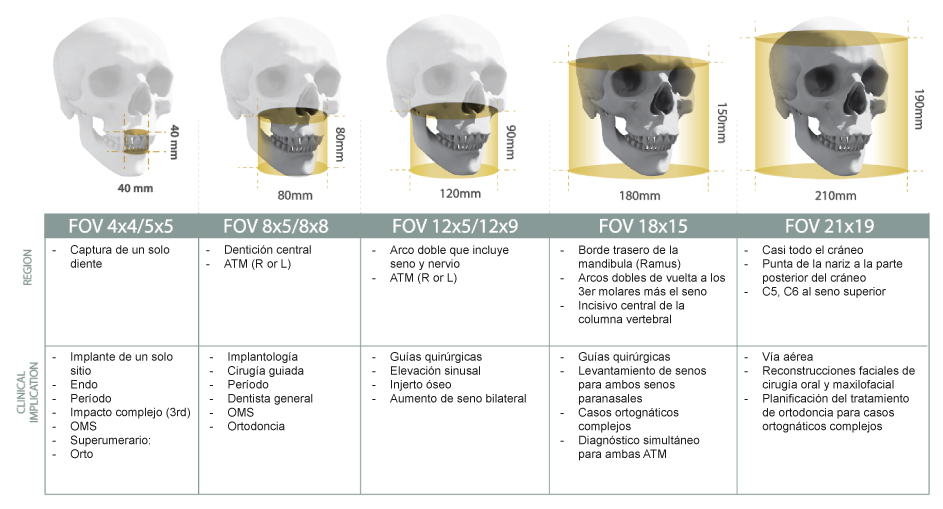 opciones cubren la región del arco completo, el seno y la ATM izquierda/derecha, y se adaptan a